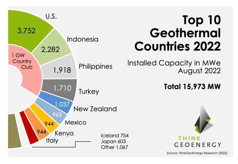 Overview of "Top 10 Geothermal Countries" based on power generation capacity. Total global capacity now stands at 15,973 MW.